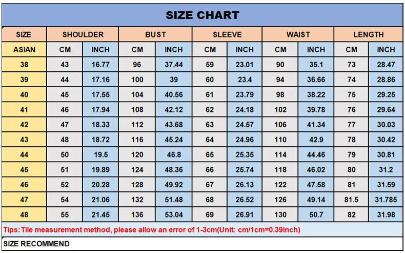 Note: Measurements may vary by 1-3cm. Shirt size should be slightly larger than your body measurements for comfortable fit. If between sizes, we recommend choosing the larger size.