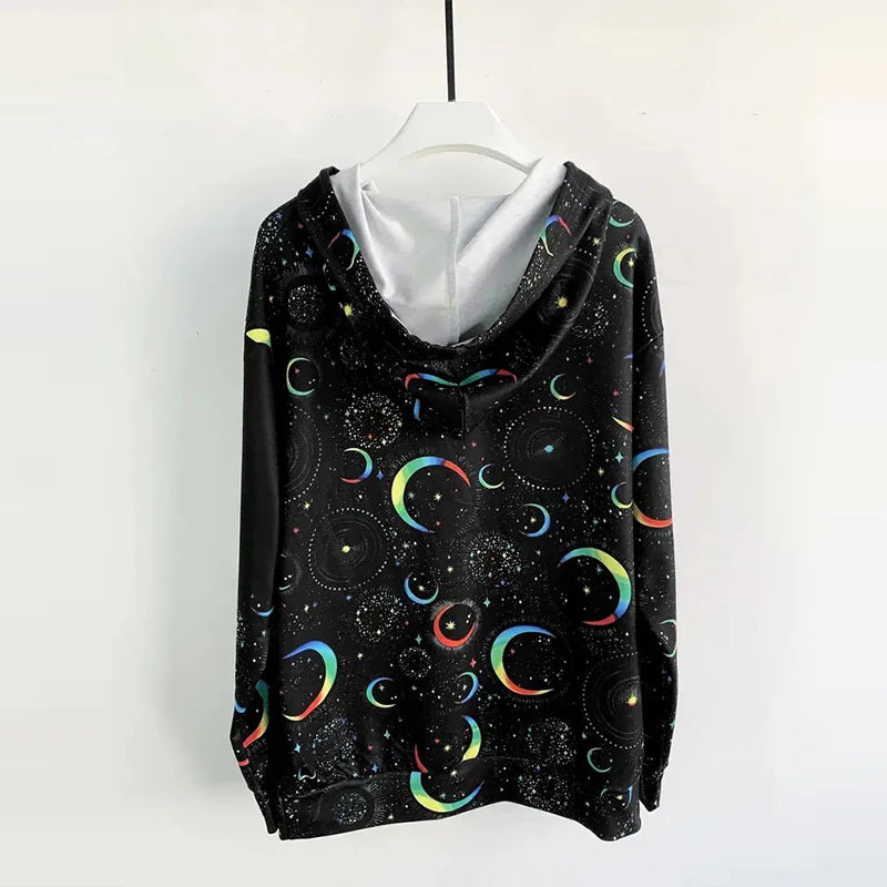 Women's Moon Print Drawstring Hoodie - Casual Long Sleeve Sweatshirt