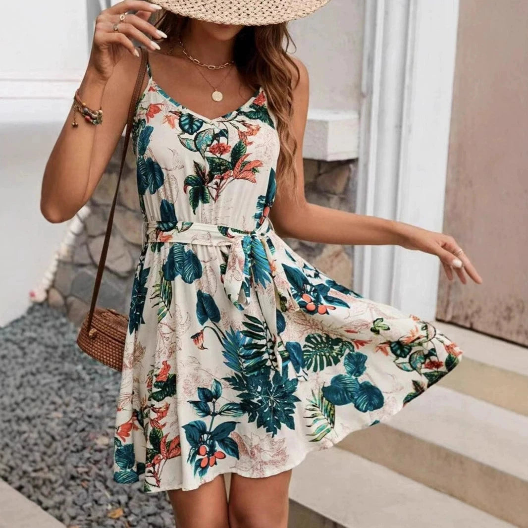 Tropical Print Beach Dress with Belt