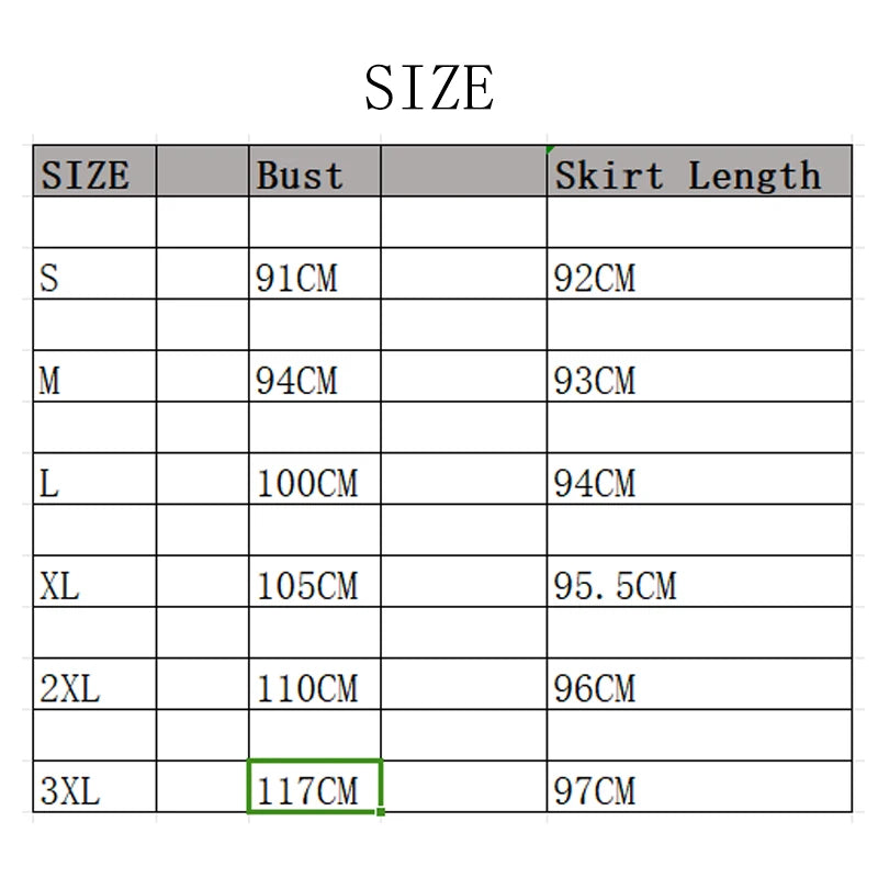 | Size | Bust (cm) | Waist (cm) | Length (cm) |